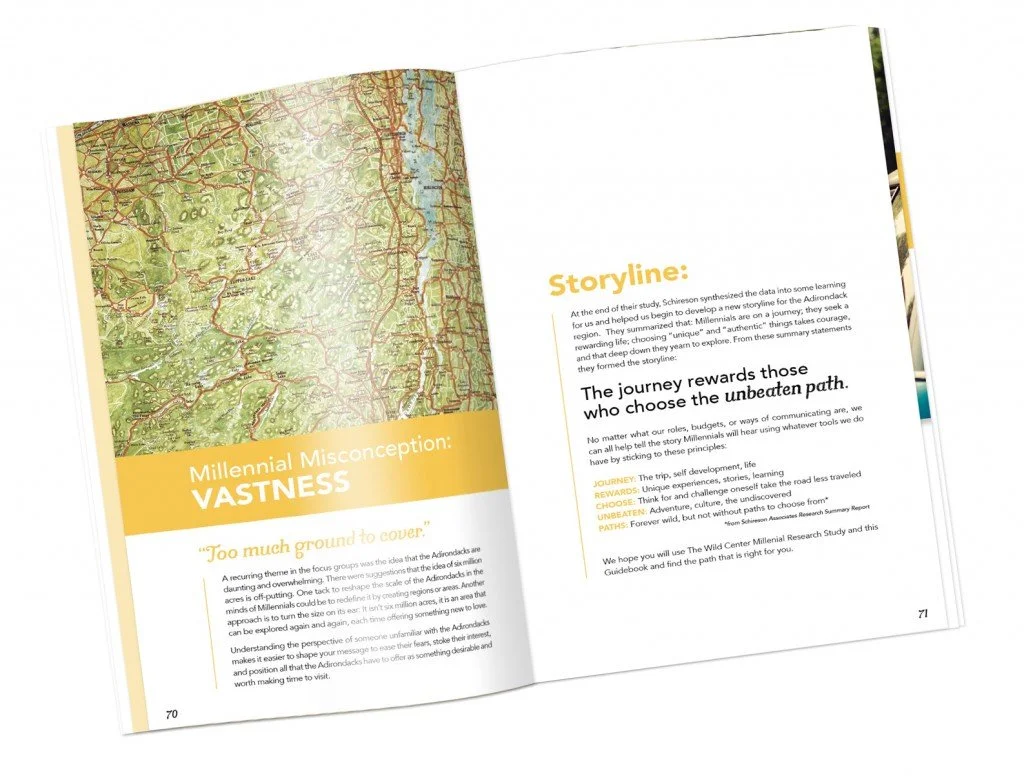So how do we convince our own demographic to choose the Adirondacks as a place to spend time and money? The W!ld Center hired Schireson Associates in New York City to do a study on millennials and the Adirondacks. They approached Trampoline to interpret that data and asked if we could take the study and create a guidebook with strategies that would help businesses, organizations and TPAs reach millennials and get them to the Adirondacks. It was an exciting opportunity for all of us, and for the owners it was a convergence of all the things they aimed to do when they founded Trampoline 13 years ago.To be honest (TBH), there was a small panic between millennial staffers at first. I hadn’t posted to Instagram in a year, Kelli hadn’t logged into Facebook in months, John had trouble wrapping his brain around the fact that some people don’t want to spend a week in the woods. But that wasn't the point, there are stronger themes that are the core of this project. The end result covers more ground than we could ever have imagined. And it's not just the book itself, it's the re-emergence of the information and solutions it holds for businesses in the Adirondacks and beyond.
